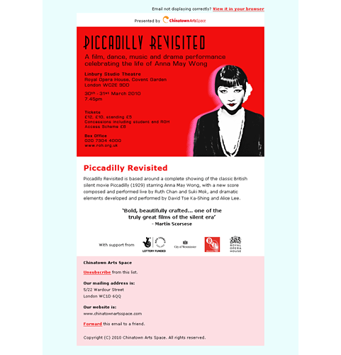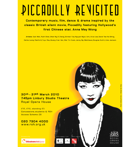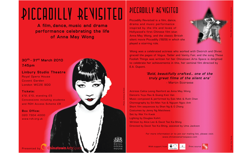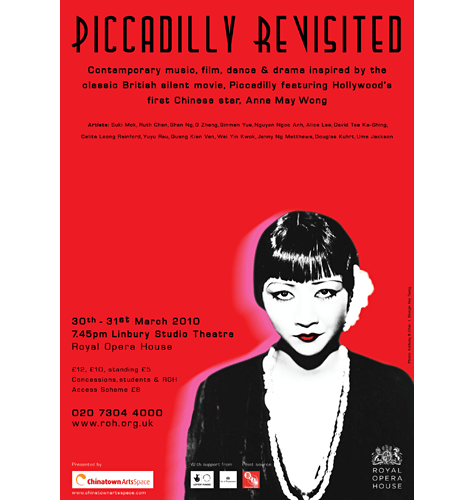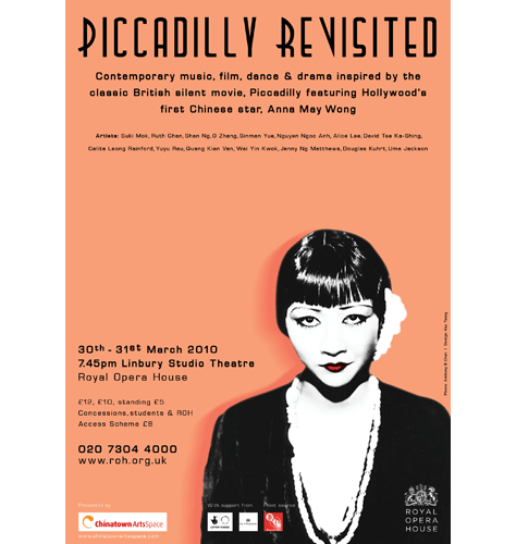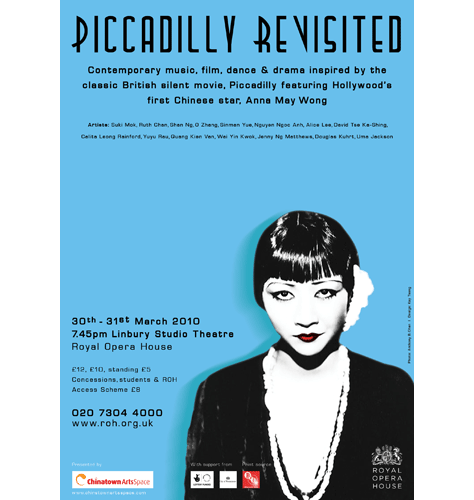 Details: Piccadilly Revisited was a film, dance, drama and music performance inspired by the life and loves of Hollywood's first Chinese film star Anna May Wong. A celebrated actress who worked with Dietrich and Olivier, graced the pages of Vogue, Tatler and Vanity Fair, and the song These Foolish Things was written for her. Chinatown Arts Space celebrated her achievements in this, her seminal film Piccadilly (1929) directed by E.A. Dupont.