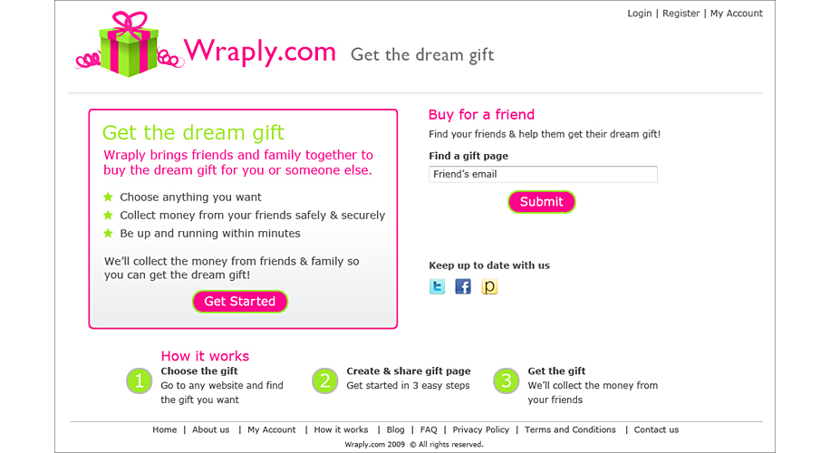 Details: Wraply is a online group gift giving platform that enables multiple people to contribute towards a single purchase. A gift organizer can locate the gift they want to purchase, set up a gift page on Wraply.com and then send invites out to ask people for contributions towards the gift. Contributors can then go to the page and pay by credit/debit card or by PayPal. Once the collection is complete, the gift organizer can purchase the gift with the funds collected.