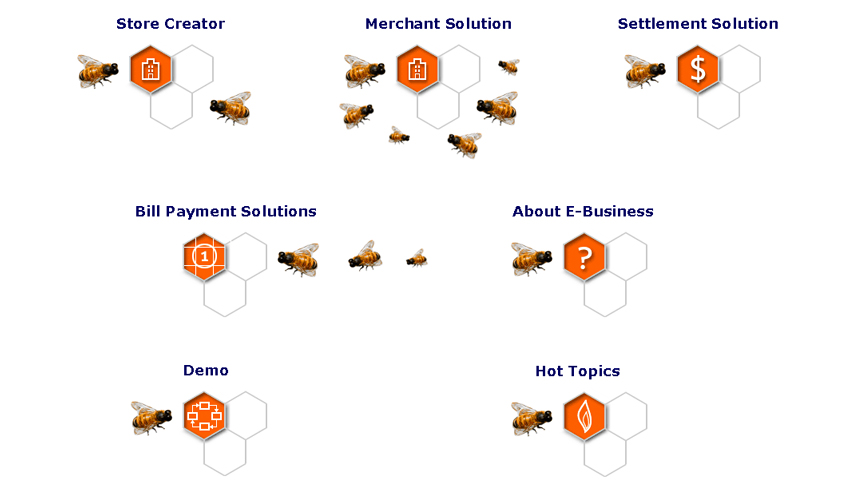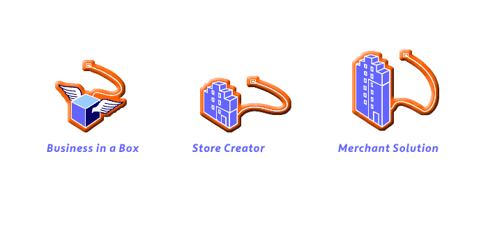 Concept: Conveying the three different types of E-commerce business solutions: Business in a Box, Store Creator and Merchant Solutions.